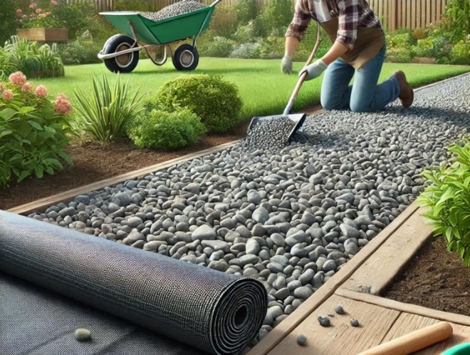 Instead of landscape fabric, you can also lay cardboard before adding gravel. It blocks weeds while decomposing naturally over time.