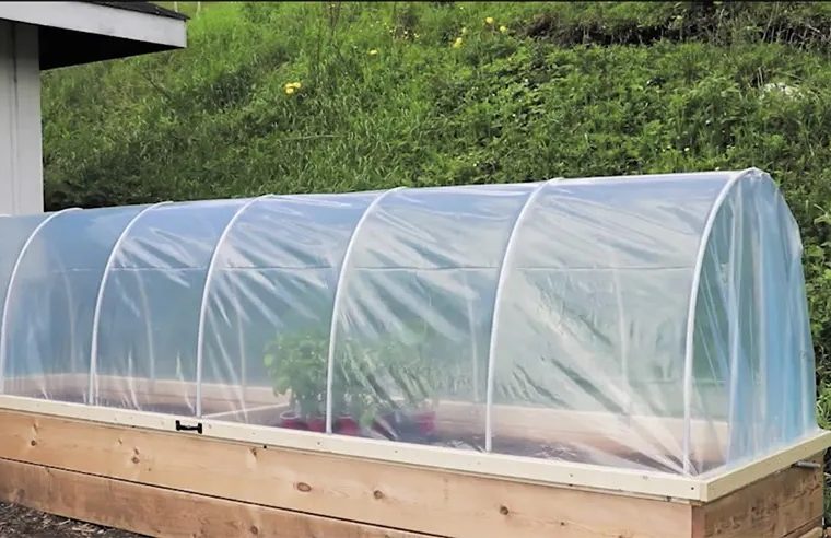 Step 5: Cover with Plastic Sheeting Drape heavy-duty plastic sheeting over the PVC hoops, leaving excess material to cover the ends of the raised bed. Trim the plastic as needed and secure it tightly using UV-resistant zip ties and staples.