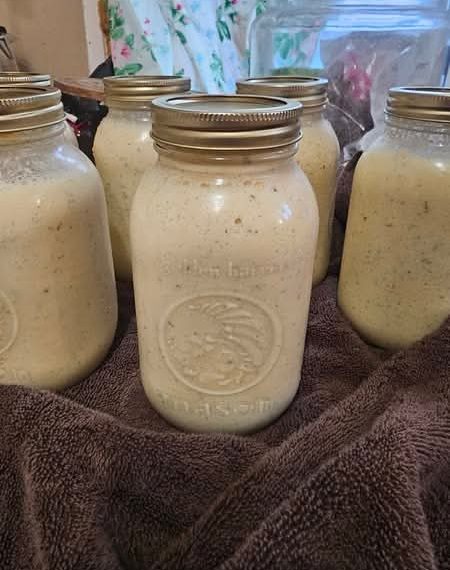 ā€œCanned Alfredo sauce, all of ’em sealed. 1 lb butter, 1 cup minced garlic, 1 gallon whole milk, 2 liters whipping cream, 2 lb shredded Parmesan, 2 lb shredded mozzarella, ½ cup chicken powder, 2 tb black pepper, ½ cup dried parsley, 1 tsp nutmeg. Pressure canning 15 min at your PSI.ā€