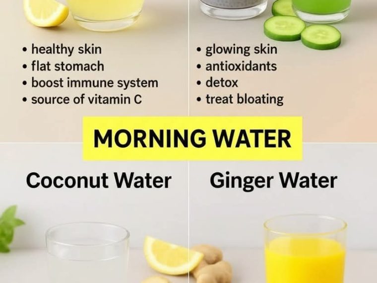 four quick recipes — Lemon Water, Chia Water, Coconut Water & Ginger Water — all in one place. Perfect for a hydration + wellness post! 💧🍋🌱🥥✨