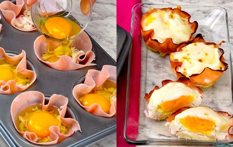 - Place a slice of ham into each muffin cup, gently pressing it down to form a “cup.”