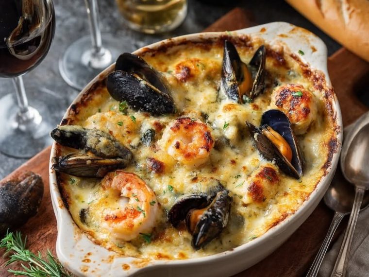 Sea Delight: Cod, Shrimp and Mussel Gratin
