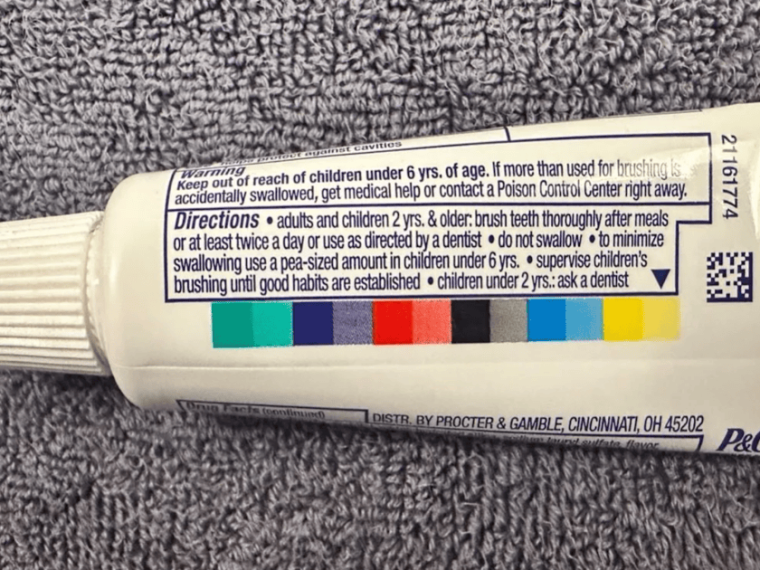 If you’ve ever seen the little colored boxes that are printed up the crimped end of a toothpaste tube and thought to yourself… “Huh, what’s that about?” — you’re not alone. For years, there have been theories surrounding the colored boxes on toothpaste and what they mean.