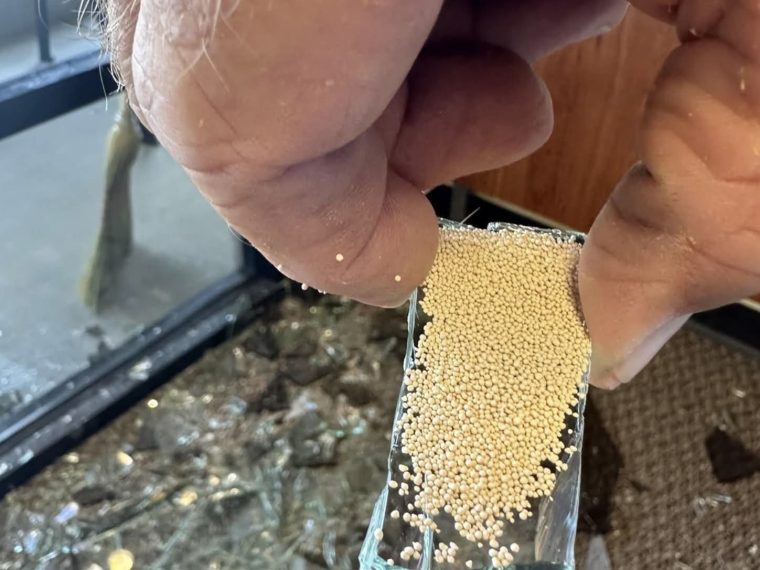 After my wife’s office was burglarized, we expected to see broken glass and the absence of property. What we would not have expected to see were several small beads amongst the broken glass. Tiny cream-colored beads were spreading throughout the floor.